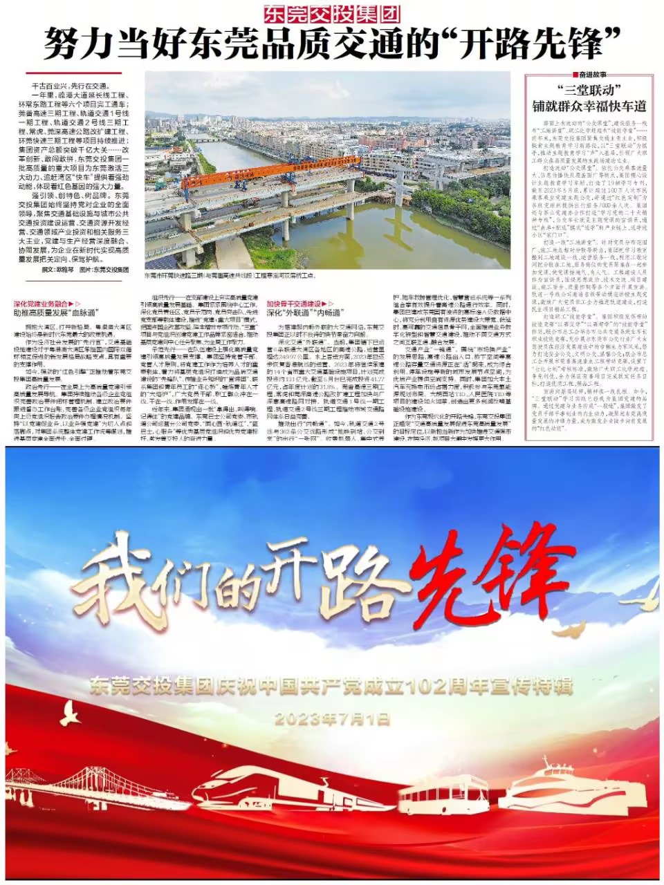 集團挖掘凝練集團先進黨組織奮進故事,在南方日報《奮進》特刊上發(fā)表題為《東莞交投集團:努力當好東莞品質(zhì)交通的“開路先鋒”》文章,宣傳報道集團抓黨建促發(fā)展的成果。制作《我們的開路先鋒》宣傳特輯,慶祝建黨102周年,講述交投各個工程黨員項目突擊隊故事,激勵集團廣大黨員干部職工獻身交投事業(yè)。