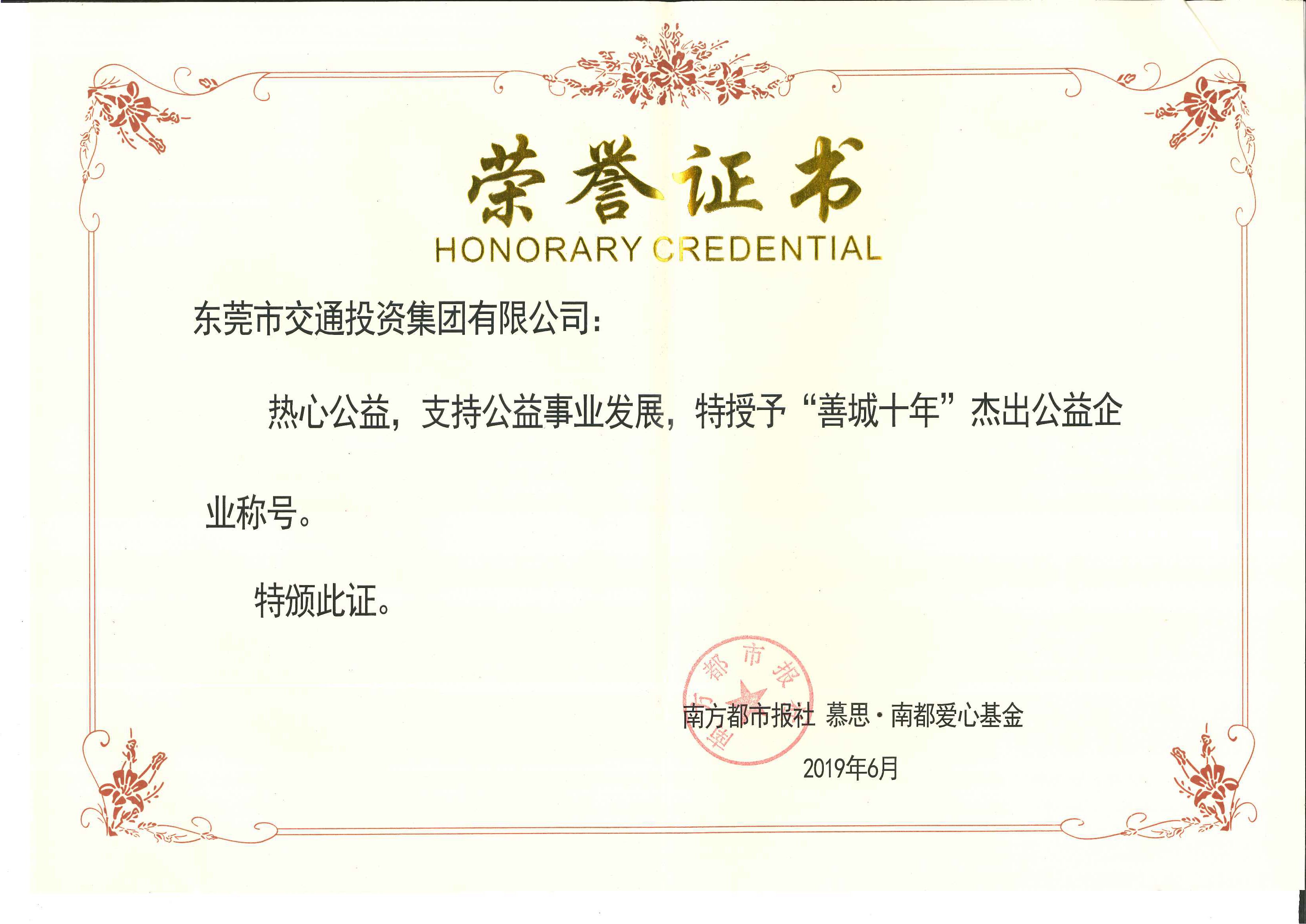 2019年6月,東莞市交通投資集團(tuán)有限公司榮獲“善城十年”杰出公益企業(yè)稱號。