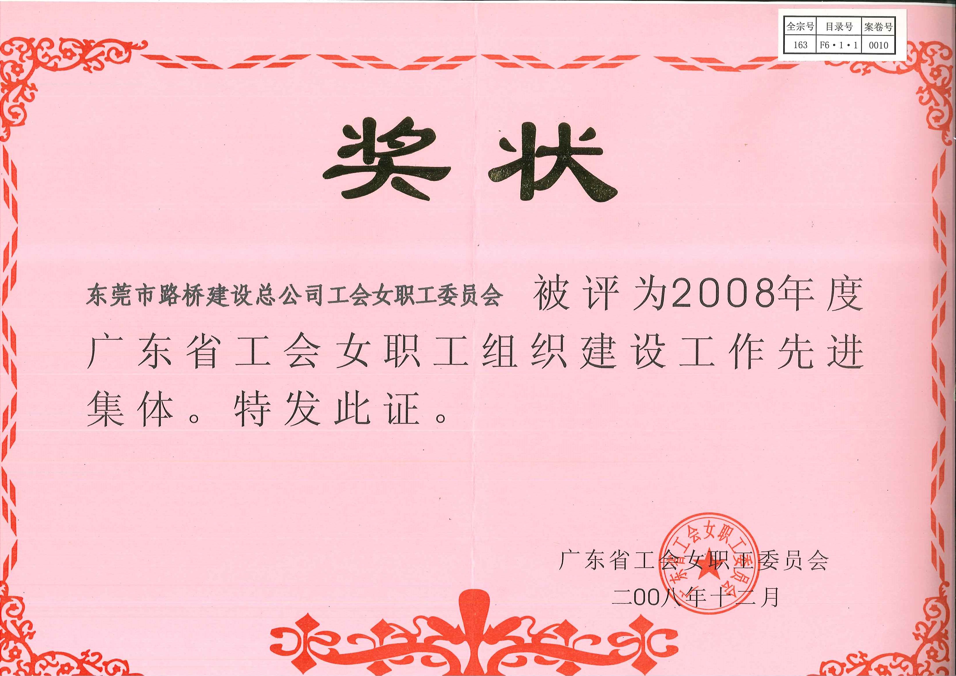 2008年12月24日,市路橋總工會女職工委員會被評為“2008年度廣東省工會女職工組織建設(shè)工作先進(jìn)集體”。