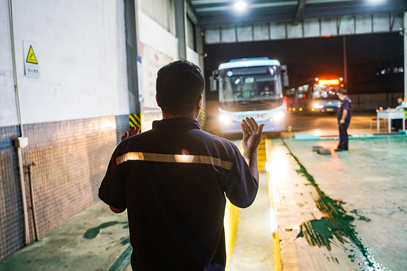 濱海灣公交公司長安涌頭停場維修車間維修師傅引導(dǎo)車輛進(jìn)入檢修區(qū)域