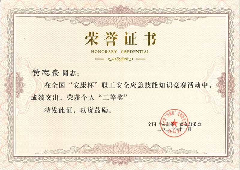 交通實業(yè)公司黃志豪榮獲2021年度全國“安康杯”競賽職工安全應(yīng)急技能知識競賽活動三等獎
