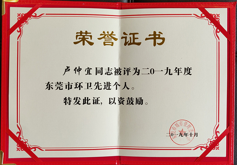 2019年10月,盧仲宜獲2019年度東莞市環(huán)衛(wèi)先進個人
