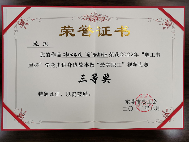 2022年9月,市路橋公司范玙榮獲東莞市總工會2022年“職工書屋杯”學(xué)黨史講身邊故事做“最美職工”視頻大賽三等獎