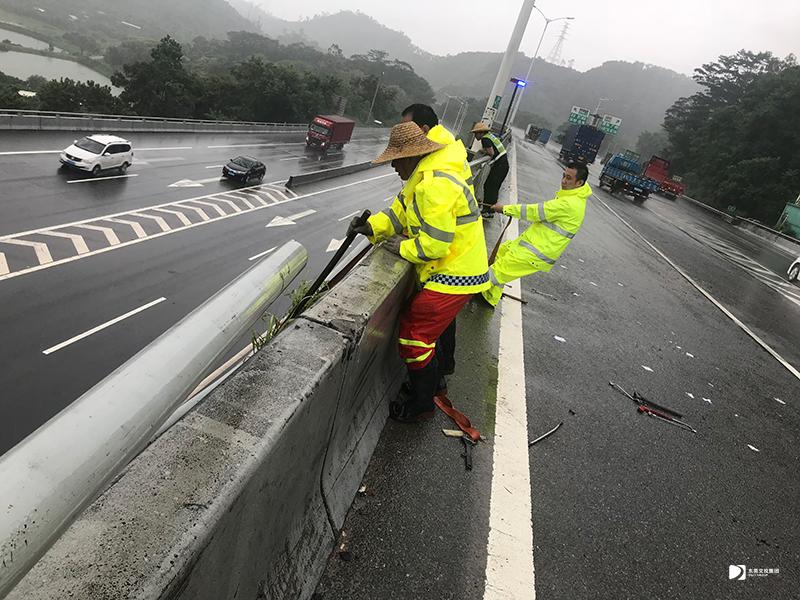 常虎分公司與經(jīng)緯公司在“山竹”臺(tái)風(fēng)后全力搶修路面受損設(shè)施