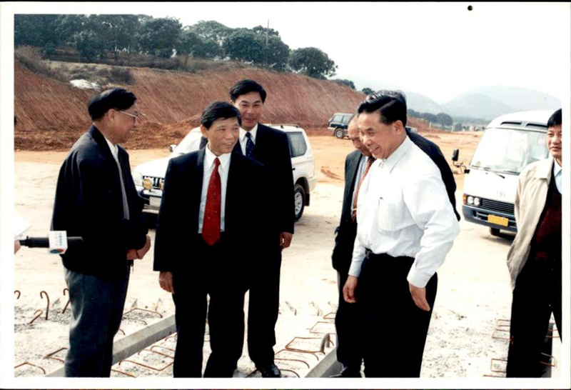 2004年6月15日,時任省交通廳陳冠雄副廳長(左三)在路橋總公司總經(jīng)理鐘旭堆(右四)的陪同下視察?;⒏咚俟方ㄔO(shè)情況。