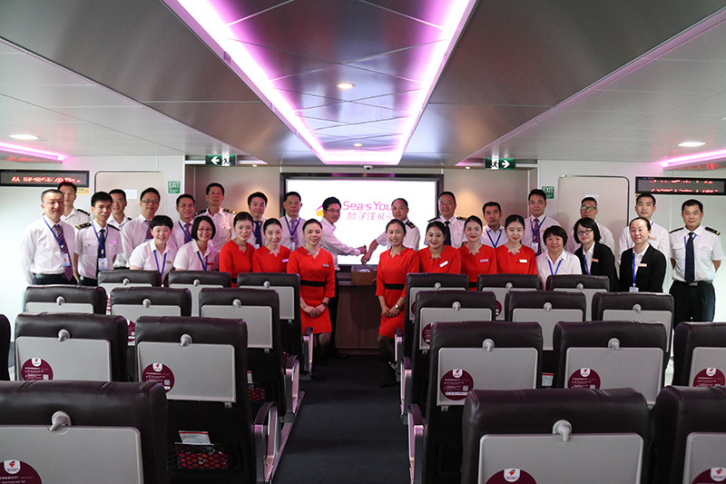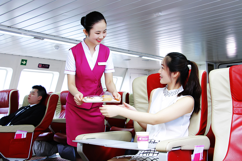 公司乘務(wù)員在船上迎接旅客上船