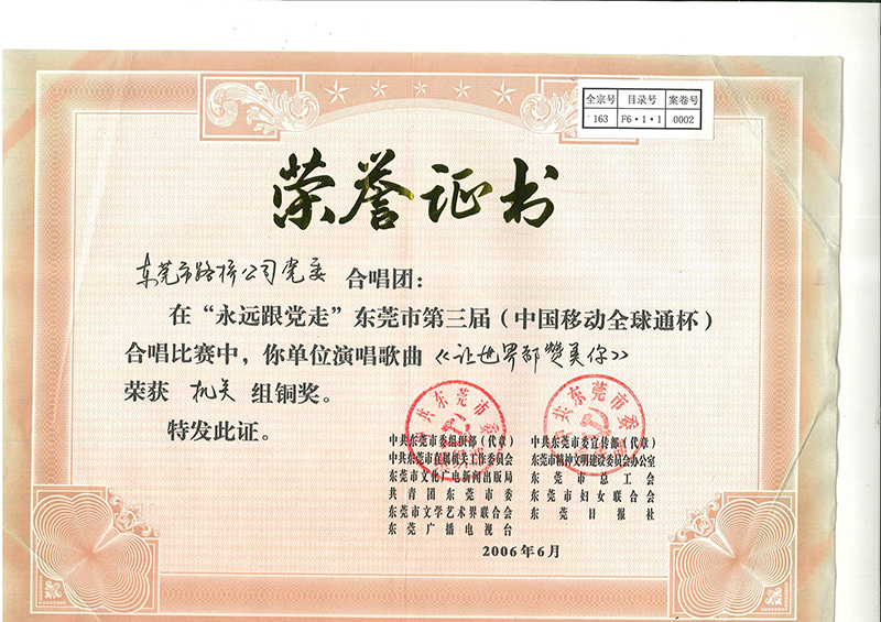 2006年6月30日,市路橋總黨委在“永遠跟黨走”東莞市第三屆(中國移動全球通杯)合唱比賽中,以《讓世界都贊美你》榮獲機關組銅獎。