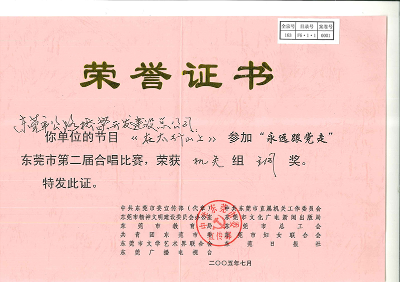 2005年7月30日,市路橋總榮獲“永遠跟黨走”東莞市第二屆合唱比賽“銅獎”。