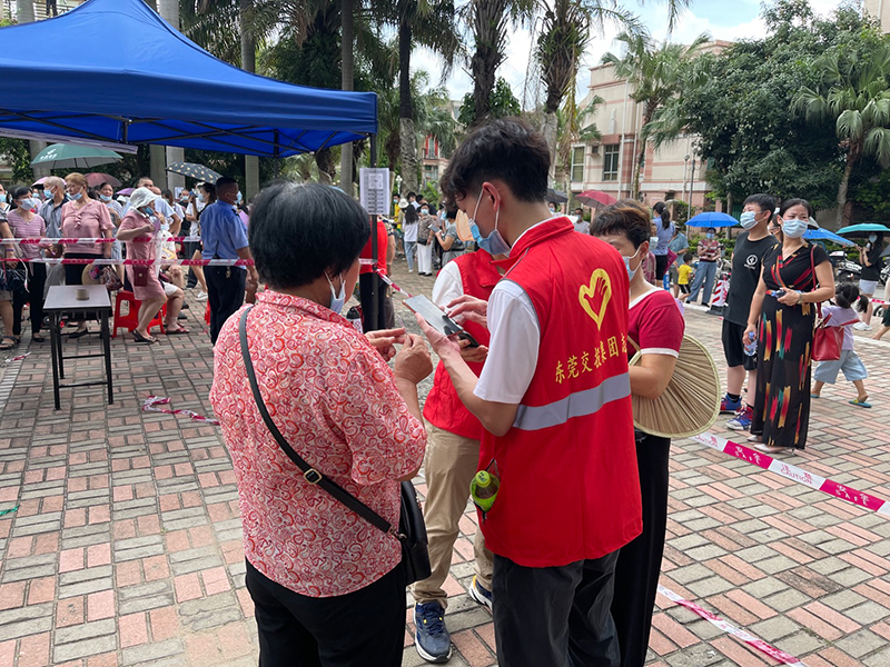 2021年6月21日,市交投集團(tuán)志愿者奔赴樟木頭一線支援全員核酸檢測工作,圖為志愿者為社區(qū)老人用手機(jī)“粵核酸”小程序錄入身份信息,生成“葵花碼”進(jìn)行核酸檢測