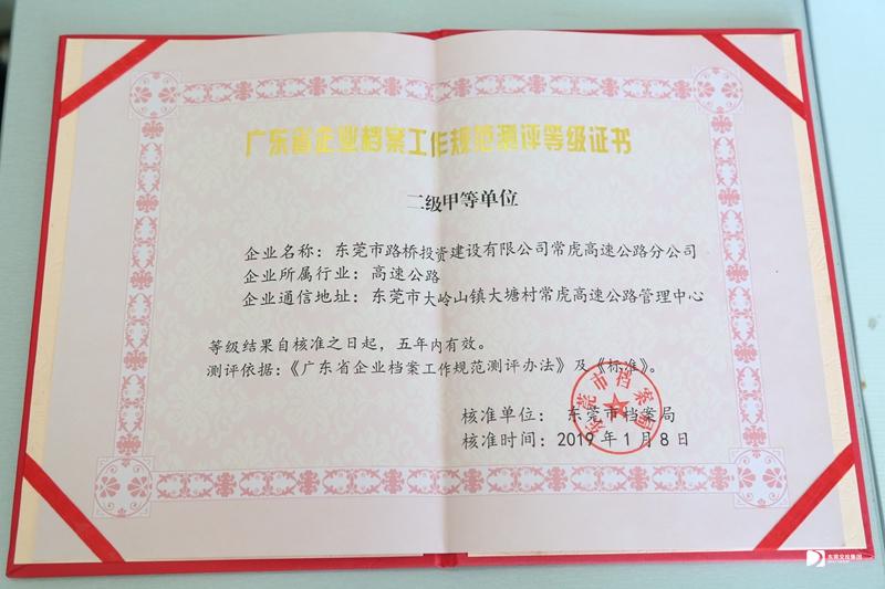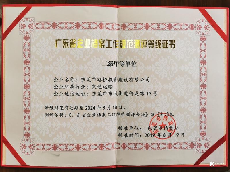 2019年8月,路橋公司獲得東莞市檔案局頒發(fā)“廣東省企業(yè)檔案工作規(guī)范測(cè)評(píng)二級(jí)甲等單位”