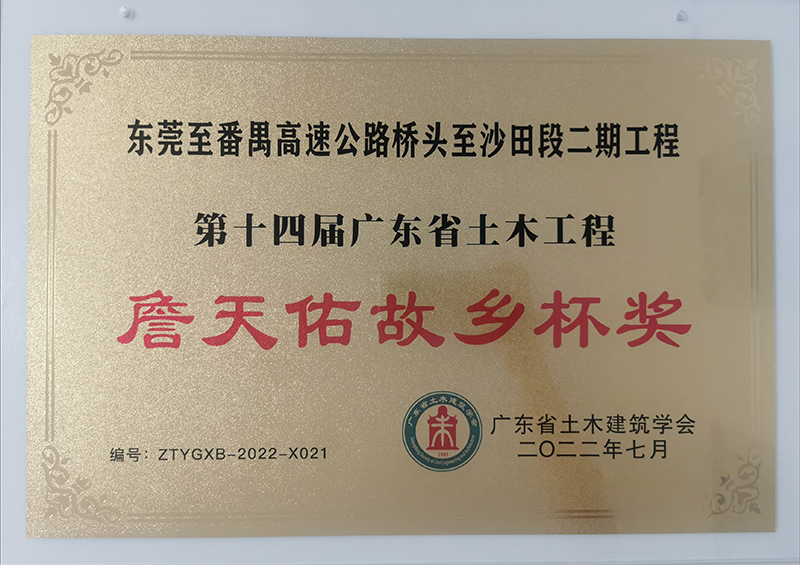 2022年7月,東莞至番禺高速公路橋頭至沙田段二期工程榮獲第十四屆廣東省土木工程詹天佑故鄉(xiāng)杯獎(jiǎng)