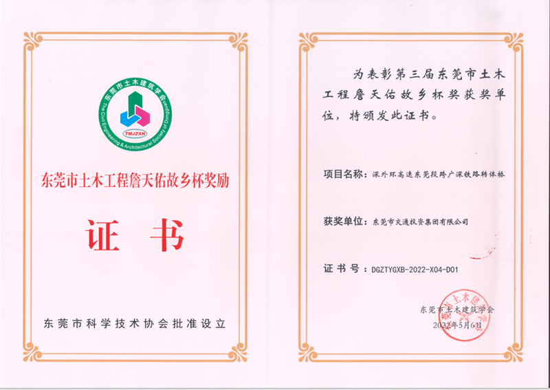 2022年5月,深外環(huán)高速東莞段跨廣深鐵路轉(zhuǎn)體橋榮獲第三屆東莞市土木工程詹天佑故鄉(xiāng)杯獎(jiǎng)
