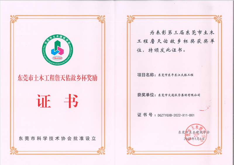 2022年5月,東莞市東平東江大橋工程榮獲第三屆東莞市土木工程詹天佑故鄉(xiāng)杯獎(jiǎng)