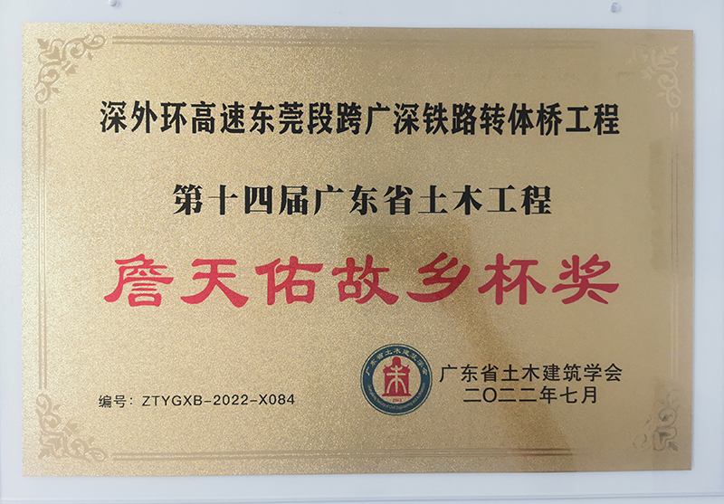 2022年7月,深外環(huán)高速東莞段跨廣深鐵路轉(zhuǎn)體橋工程榮獲第十四屆廣東省土木工程詹天佑故鄉(xiāng)杯獎(jiǎng)
